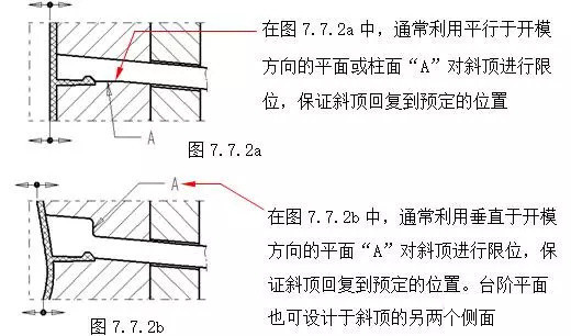 在斜頂機(jī)構(gòu)中,為了保證斜頂工作穩(wěn)定、可靠,應(yīng)該注意以下幾點(diǎn):(A)斜頂?shù)膭傂?。增?qiáng)斜頂剛性一般采用:1.在結(jié)構(gòu)允許的情況下,盡量加大斜頂橫斷面尺寸。(參見(jiàn)第七章7.2節(jié))2.在可以滿足側(cè)向出模的情況下,斜頂?shù)男倍冉恰癆”盡量選用較小角度,斜角A一般不大于20°,并且將斜頂?shù)膫?cè)向受力點(diǎn)下移,如增加圖7.7.1a中的鑲塊2,同時(shí)鑲塊可以具有較高的硬度,提高 模具 的壽命。(B)斜頂橫向移動(dòng)空間。如圖7.7.1a所示尺寸“D”,為了保證斜頂在頂出時(shí)不與膠件上的其它結(jié)構(gòu)發(fā)生干涉,應(yīng)充分考慮斜頂?shù)膫?cè)向分模距離、斜頂?shù)男倍冉恰癆”,以保證有足夠的橫向移動(dòng)空間“D”。(C)斜頂在開(kāi)模方向的復(fù)位。為了保證合模后,斜頂回復(fù)到預(yù)定的位置,一般采用下面的結(jié)構(gòu)形式。如圖7.7.2a;7.7.2b。