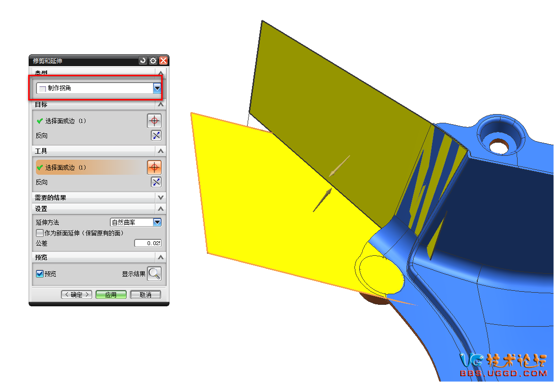 2.用“修剪和延伸”命令將兩個(gè)面創(chuàng)建拐角,注意類(lèi)型選擇制作拐角,結(jié)果如圖所示