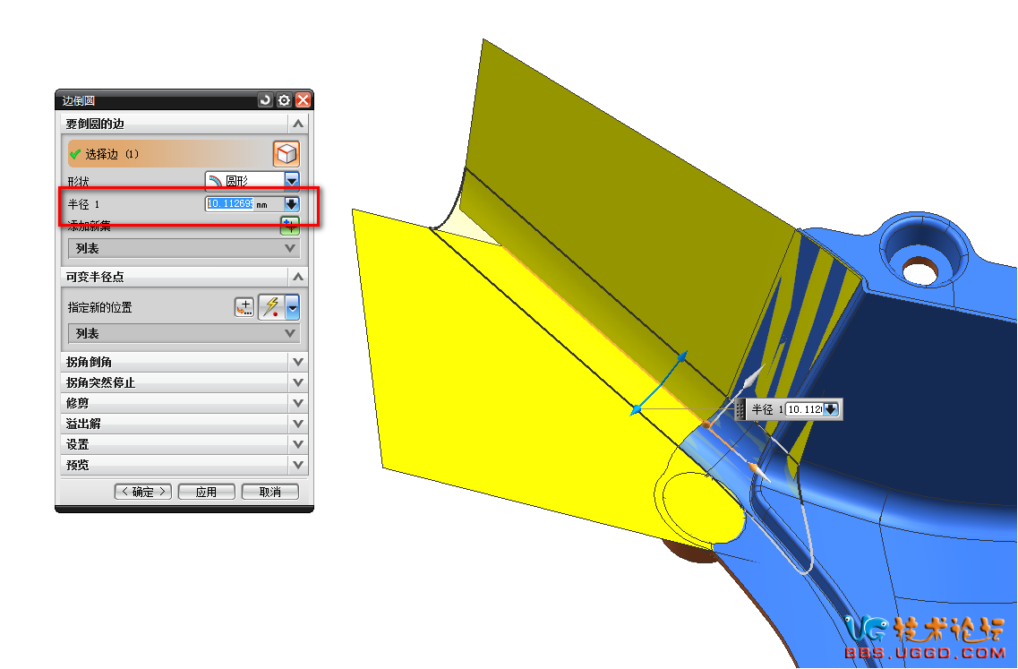 3.用“幾何屬性”命令測(cè)量?jī)蓚€(gè)面之間的R角是多少,并且將R角的數(shù)據(jù)復(fù)制下來(lái),然后用“邊倒圓”命令將R角倒上,粘貼R角的數(shù)據(jù)到半徑1對(duì)話框中,確定